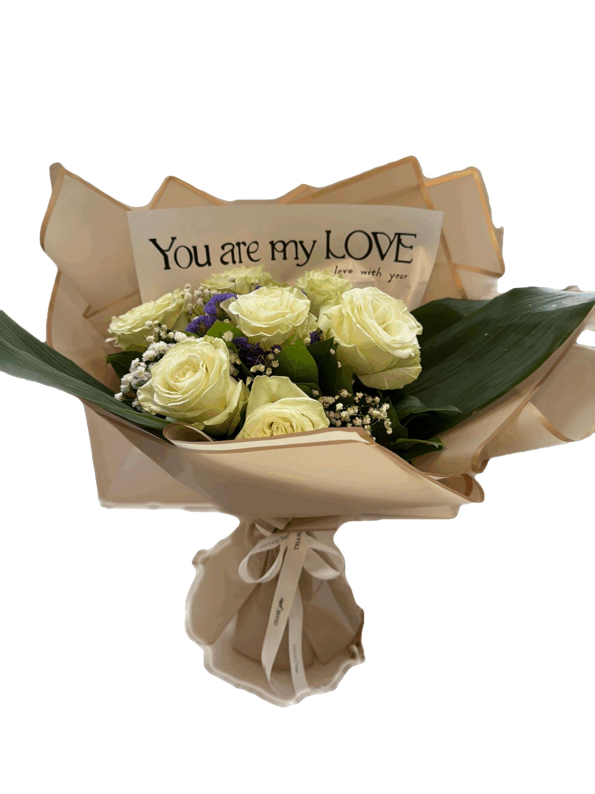 Ein eleganter Strauß aus edlen cremeweißen Rosen, stilvoll kombiniert mit zartem Schleierkraut, feinen violetten Akzenten und sattem Grün. Die hochwertige Verpackung in warmen Beigetönen mit der Aufschrift „You are my LOVE“ verleiht dem Arrangement eine besonders gefühlvolle und moderne Ausstrahlung. Weiße Rosen stehen für Reinheit, Ehrlichkeit und tiefe Verbundenheit – perfekt für Hochzeiten, Verlobungen, Geburtstage oder als liebevolle Geste von Herzen.