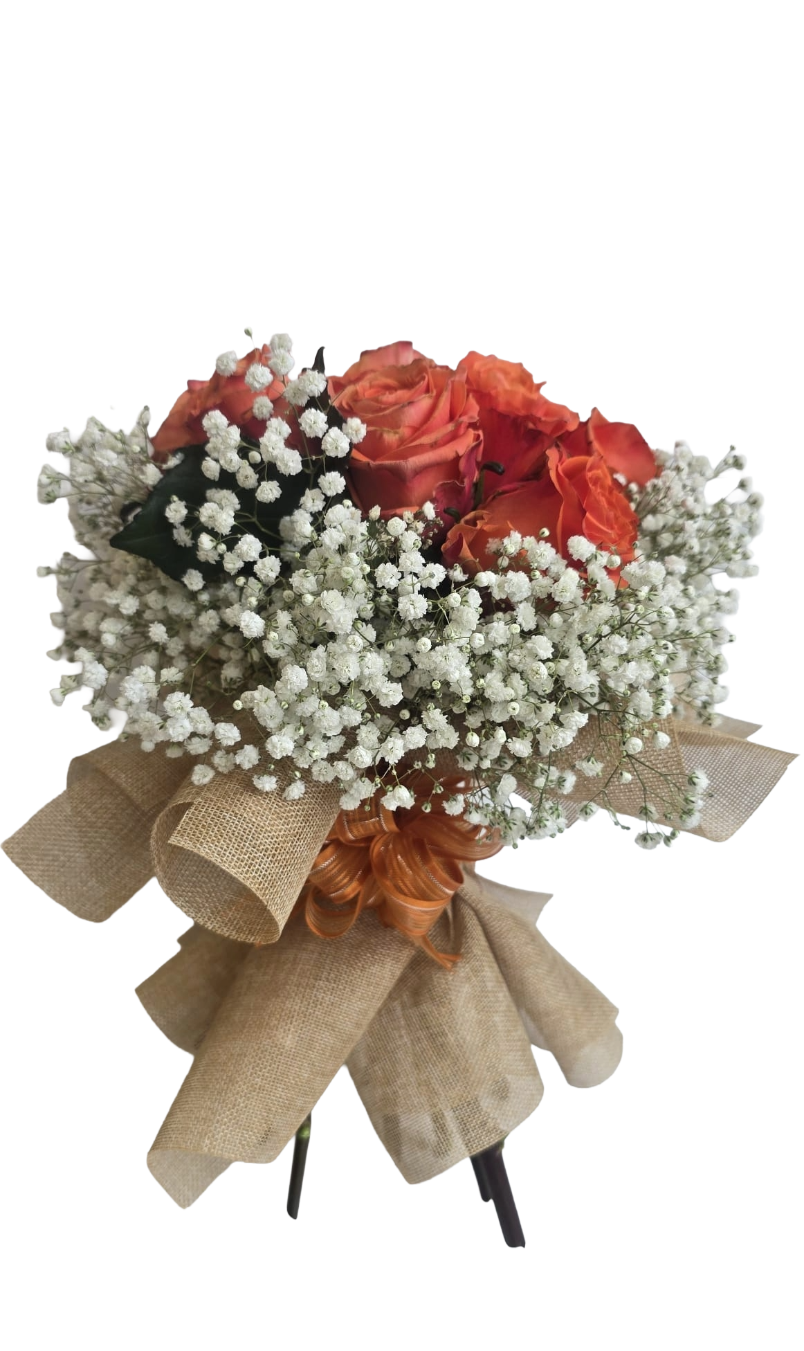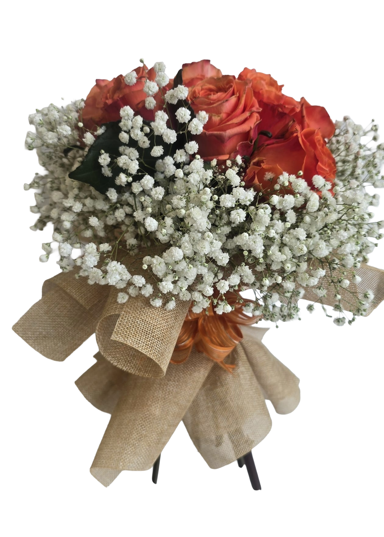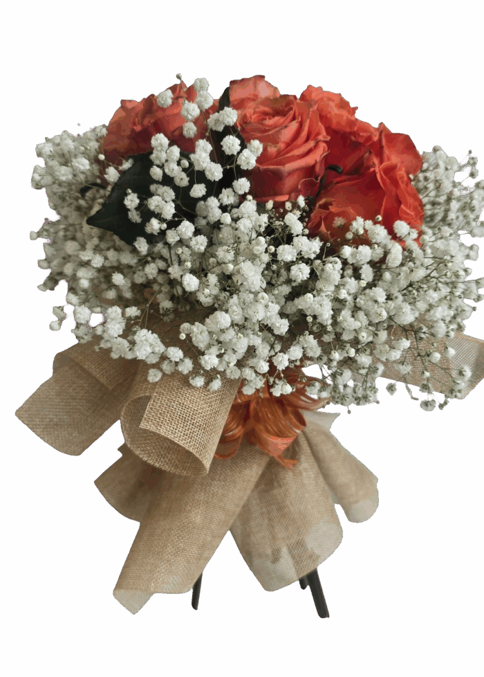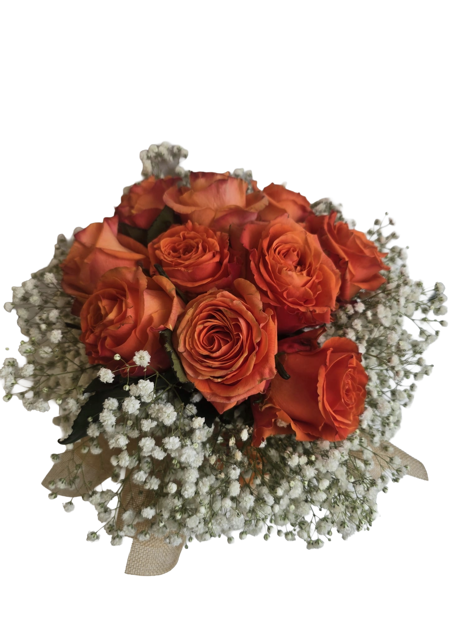 Ein stilvoller Rosenstrauß in warmen Orangetönen, kombiniert mit zartem Schleierkraut und einer natürlichen Jute-Schleife. Die kräftigen Rosen stehen für Wärme, Lebensfreude und Wertschätzung, während das feine Schleierkraut dem Arrangement eine elegante Leichtigkeit verleiht. Ideal als Geschenk für besondere Anlässe, als Dankeschön oder um einfach Freude zu schenken.