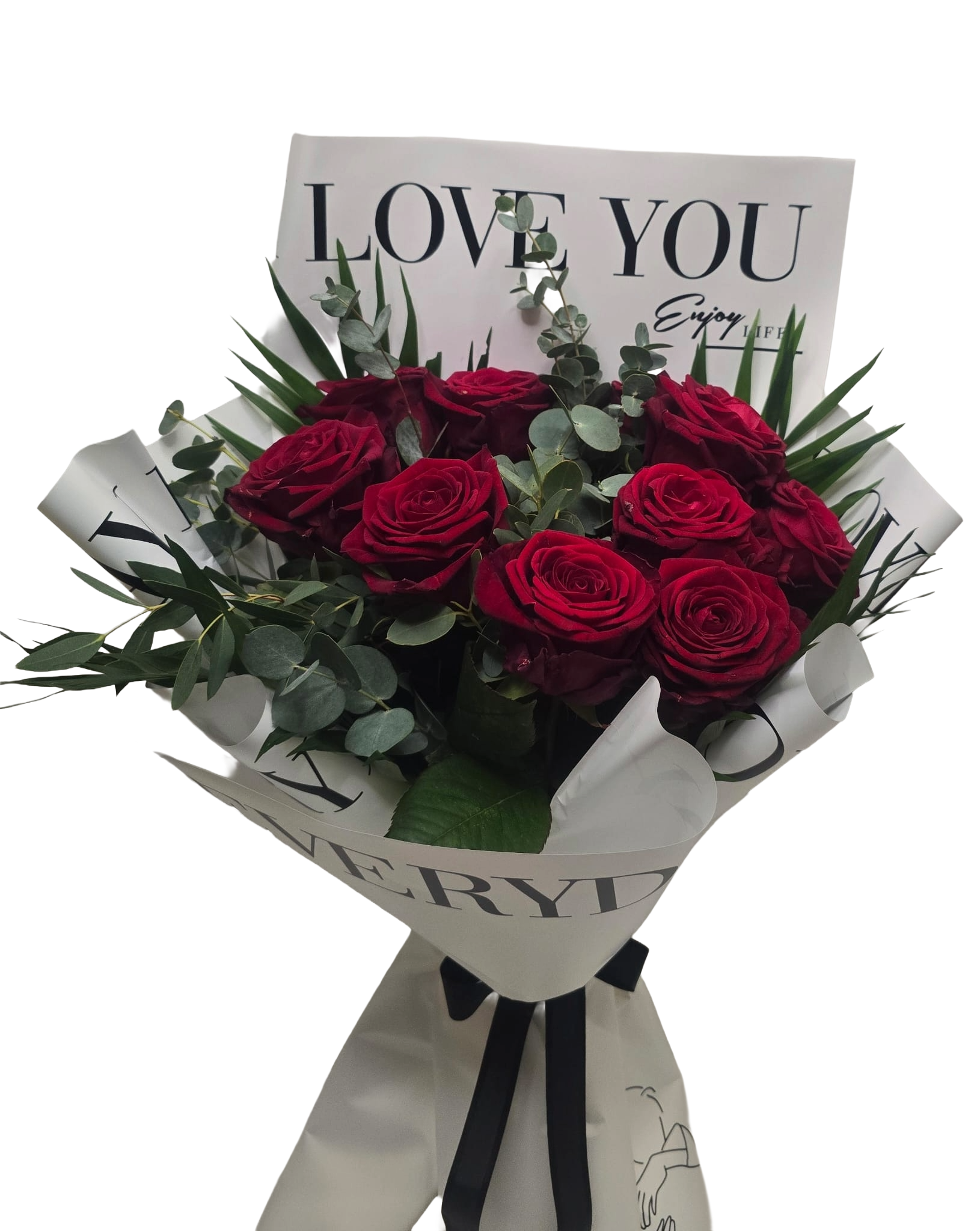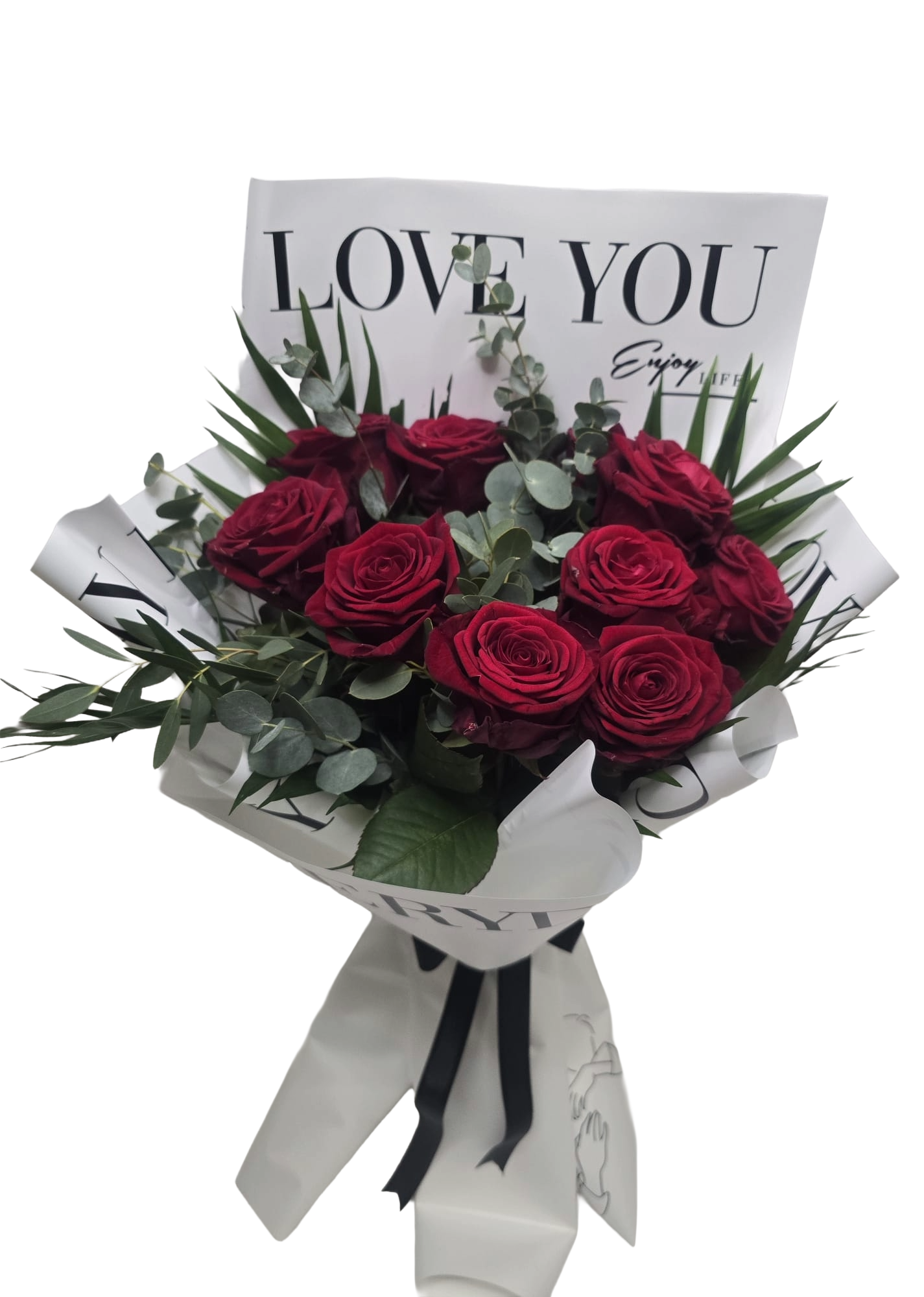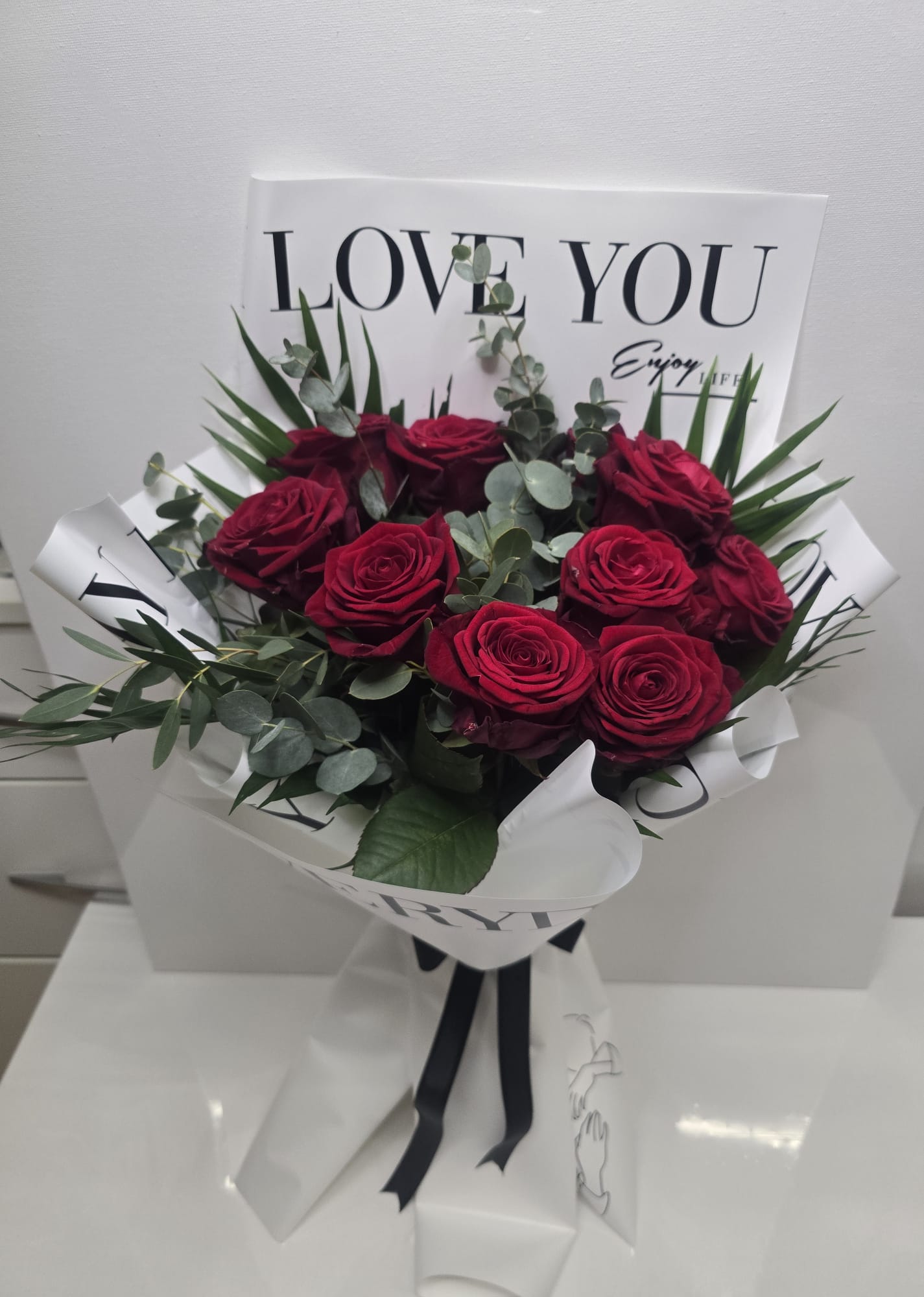 Ein eleganter Strauß aus tiefroten Rosen, harmonisch ergänzt durch frisches Eukalyptusgrün und moderne Blattakzente. Die hochwertige weiße Geschenkverpackung mit „LOVE YOU“-Design und schwarzer Schleife verleiht dem Arrangement eine edle, zeitlose Optik. Rote Rosen stehen für Liebe, Leidenschaft und tiefe Verbundenheit – ideal für Jahrestage, Valentinstag, Geburtstage oder als romantische Überraschung zwischendurch.
